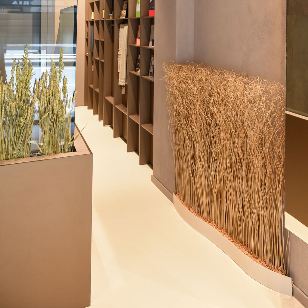 L’ingresso introduce immediatamente il linguaggio del progetto, dove la natura diventa il primo segno di accoglienza e identità. Spighe e graminacee ornamentali richiamano le origini di Cerasa e il legame con la materia, traducendo la storia dell’azienda in un gesto contemporaneo.